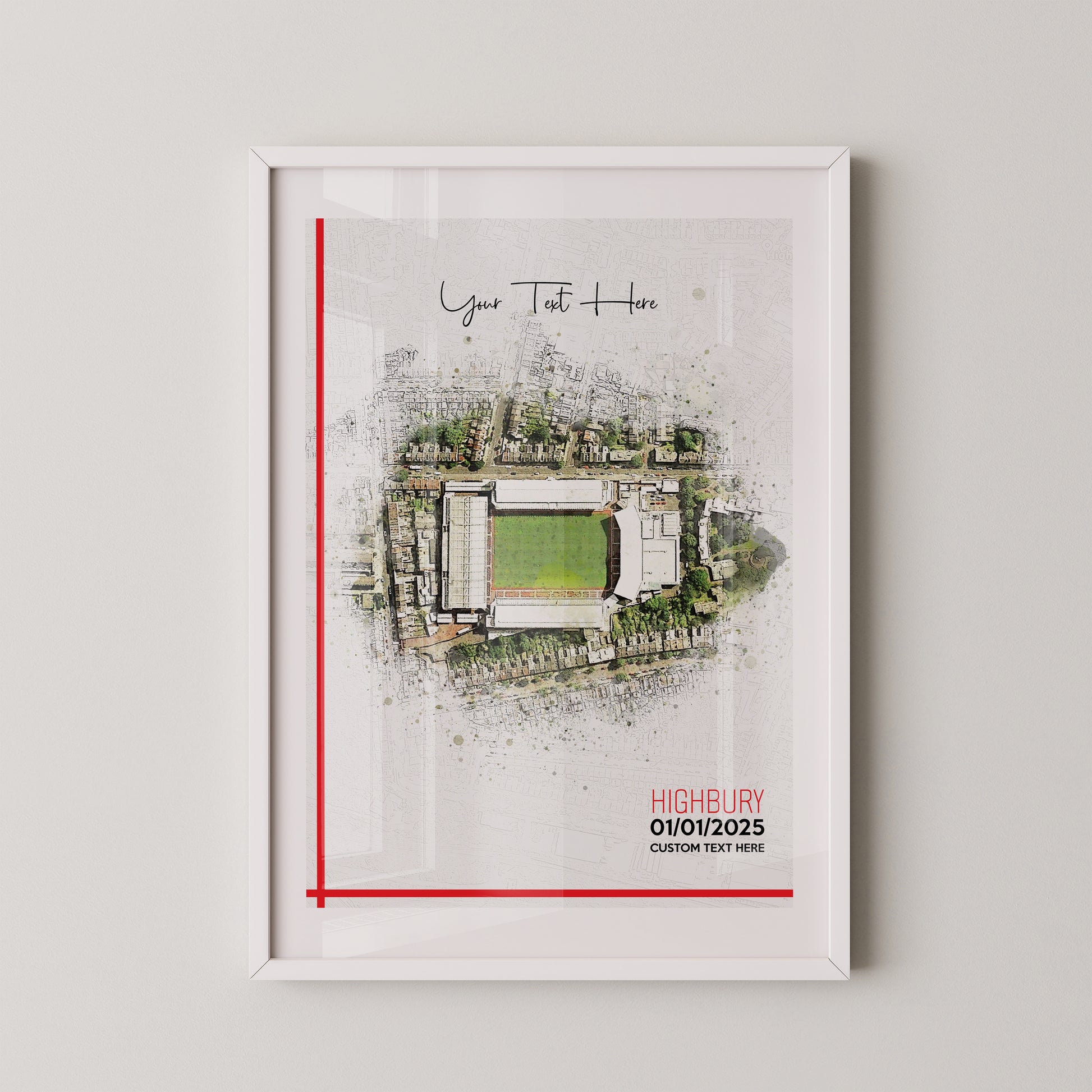 Arsenal, 'Highbury' Football Stadium Poster Artwork, Personalised Watercolour Art Print, Custom Aerial Layout - Framing options available ANY STADIUM Worldwide.