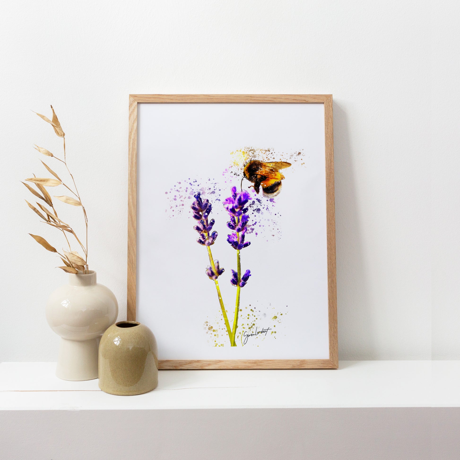Bumblebee Lavender Plant Portrait Splatter Style Artwork Fine Art Print (Unframed)