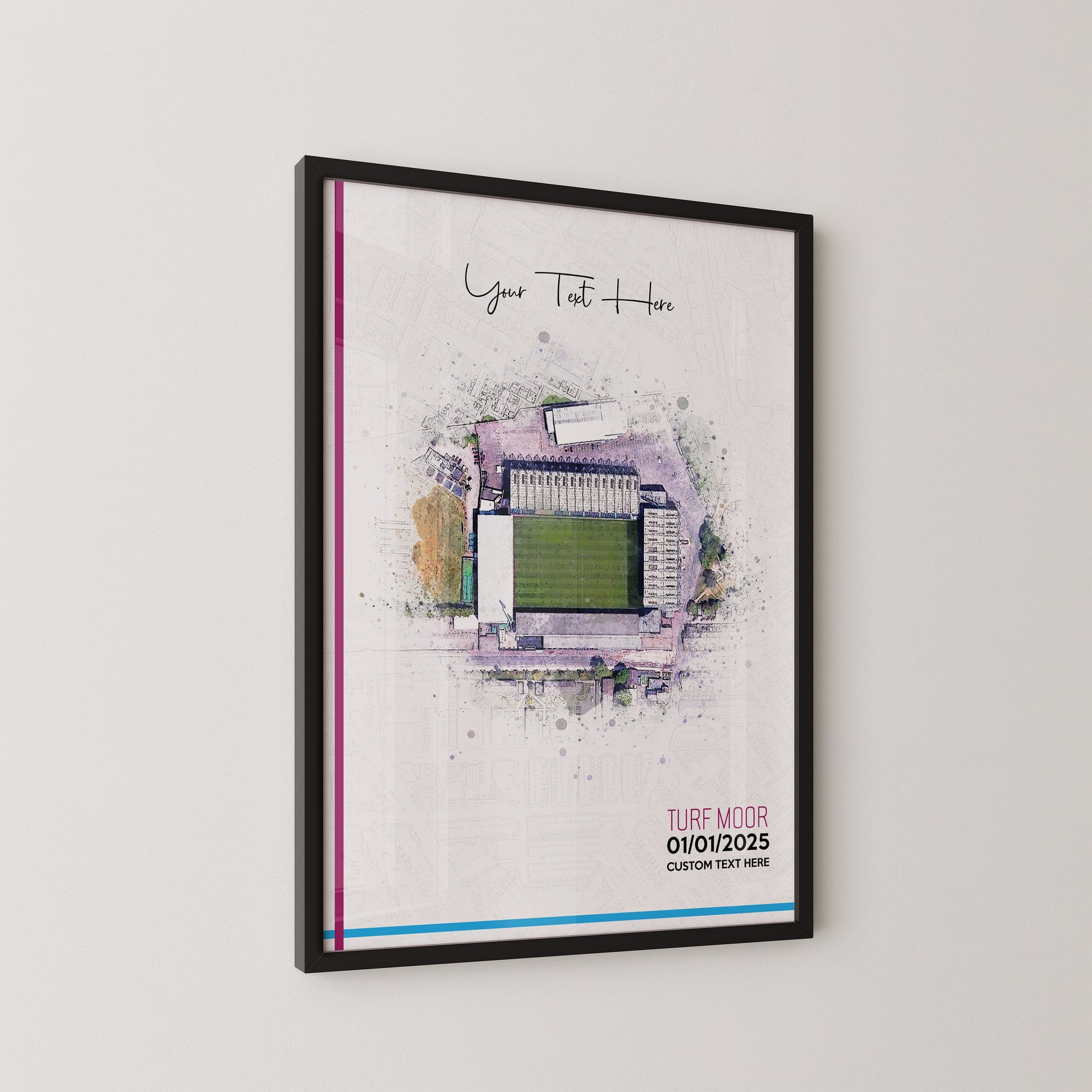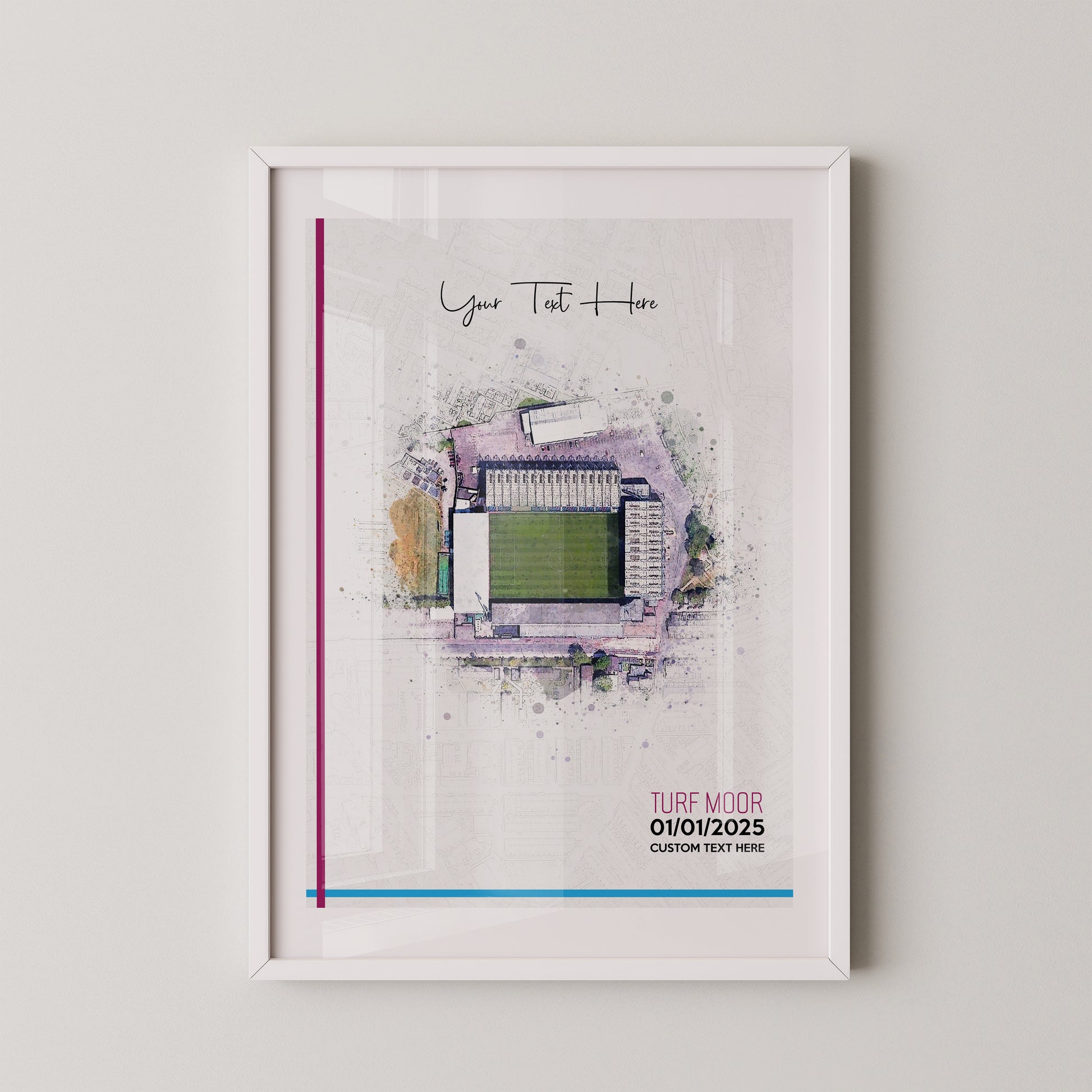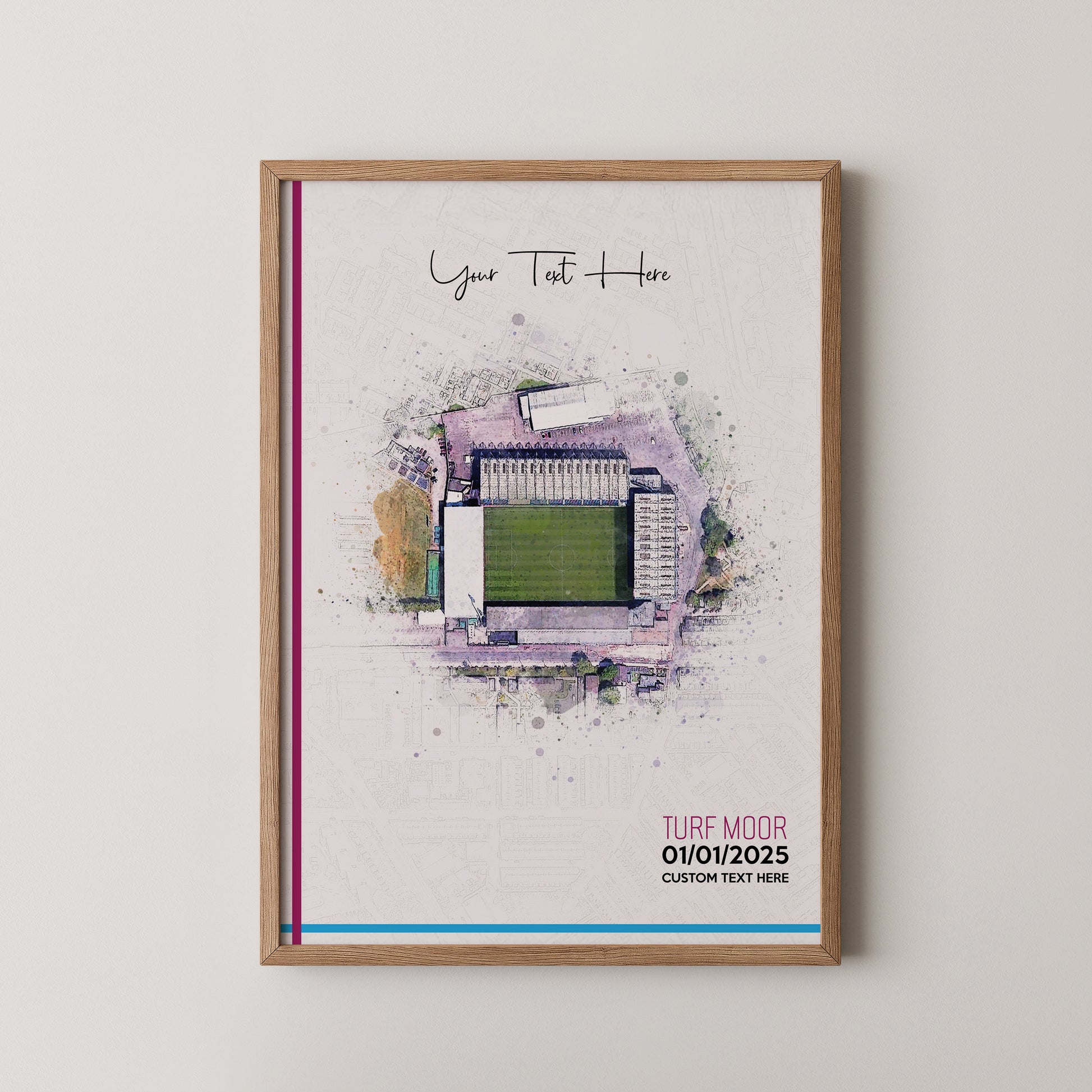 Burnley, 'Turf Moor' Football Stadium Poster Artwork, Personalised Watercolour Art Print, Custom Aerial Layout - Framing options available ANY STADIUM Worldwide.