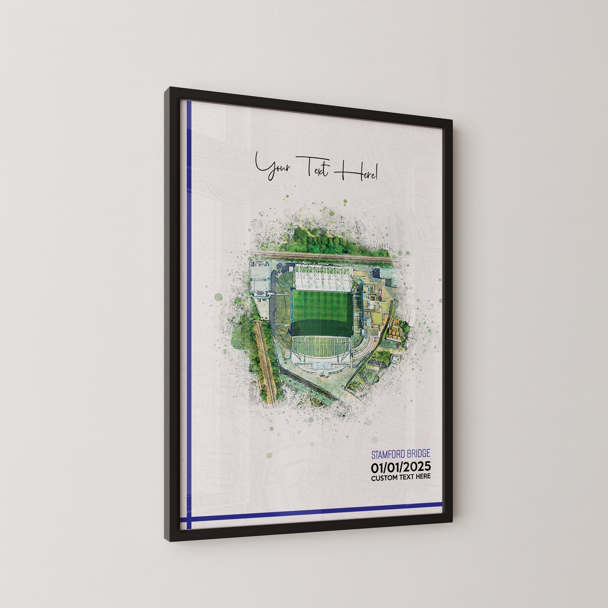 Chelsea, 'Stamford Bridge' Football Stadium Poster Artwork, Personalised Watercolour Art Print, Custom Aerial Layout - Framing options available ANY STADIUM Worldwide.
