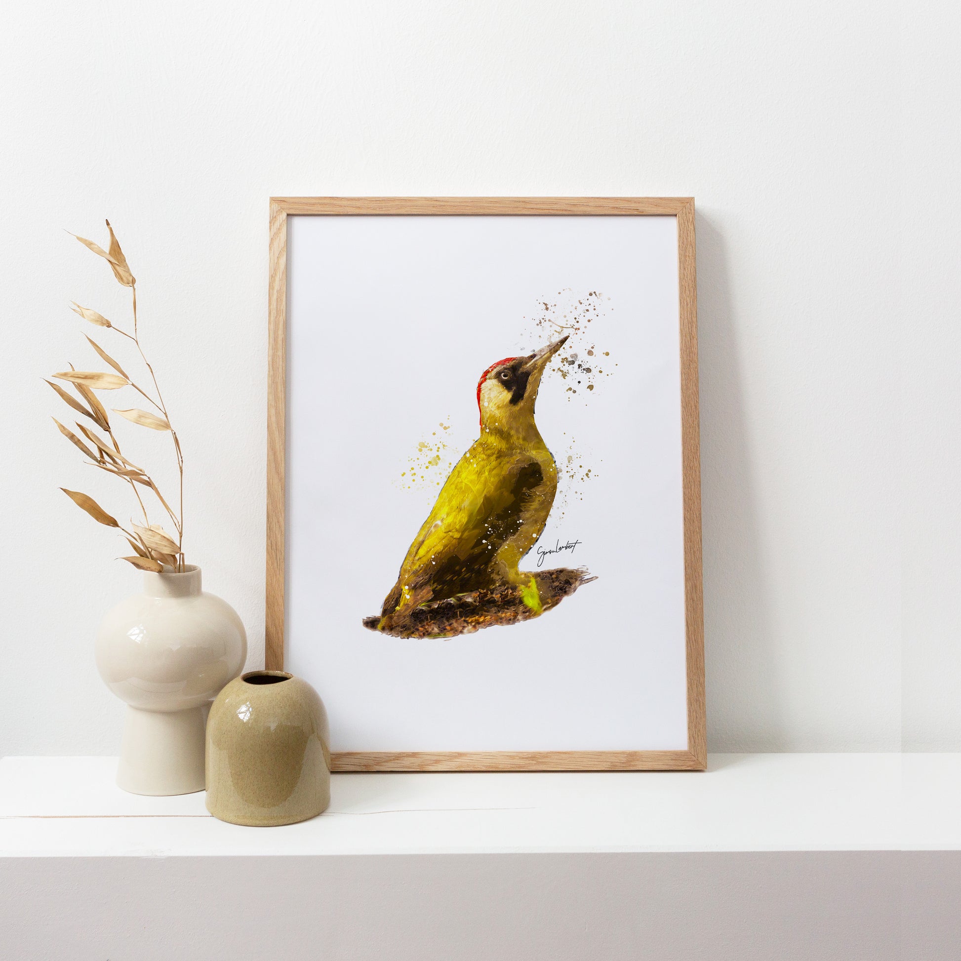 Green Wood Pecker Portrait Splatter Style Artwork Fine Art Print (Unframed)