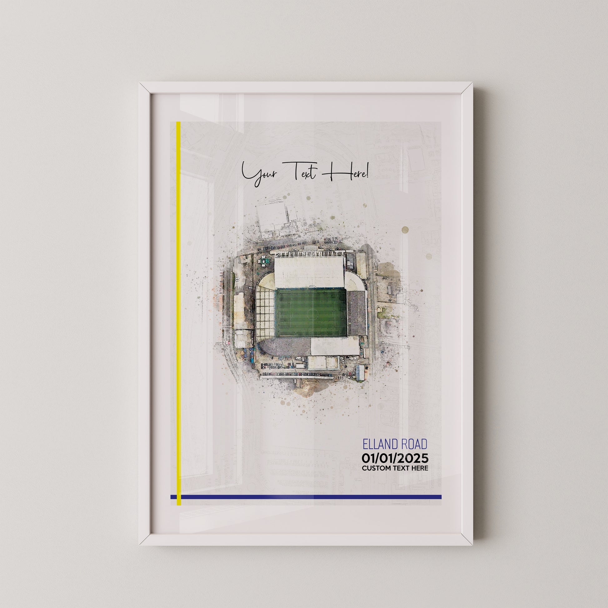 Leeds United, 'Elland Road' Football Stadium Poster Artwork, Personalised Watercolour Art Print, Custom Aerial Layout - Framing options available ANY STADIUM Worldwide.