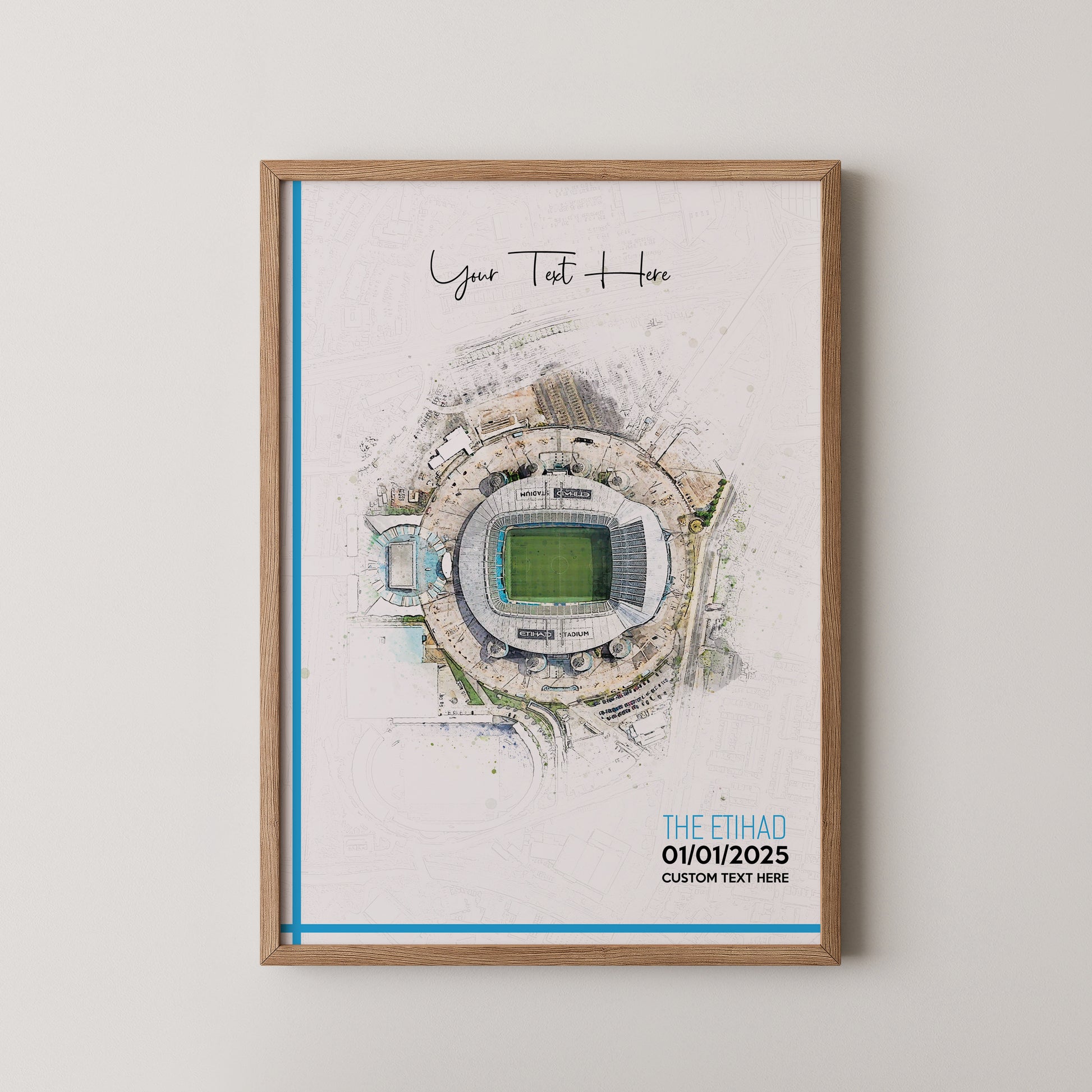 Manchester City, 'Etihad' Football Stadium Poster Artwork, Personalised Watercolour Art Print, Custom Aerial Layout - Framing options available ANY STADIUM Worldwide.